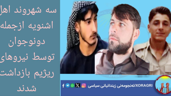 خۆڕاگری: دو نوجوان ١٧سالە به نامهای ریبوار موسوی و ظاهر آذری و یک شهروند دیگر اهل شنو به نام فخرالدین خالدی توسط رژیم دستگیر شدهاند.