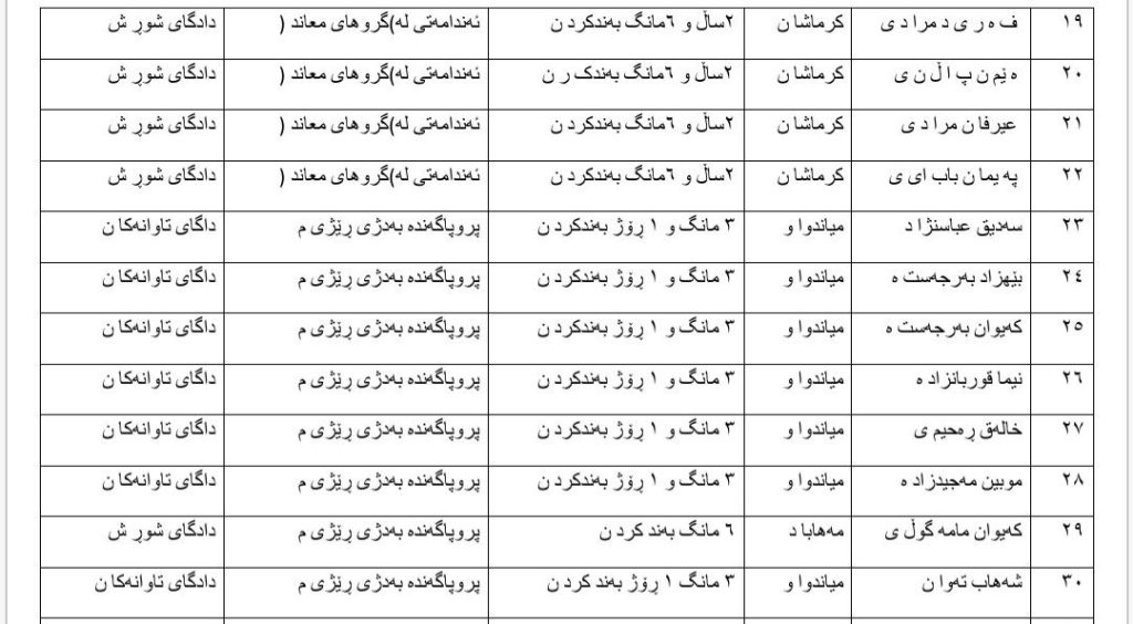 بە شێوەیەکی گشتی ئەو سزادراوانە لە سەر یەک بە ٤٩ ساڵ و ١مانگ و ١٠ڕۆژ بەند کردنی تەعزیری و مەحکووم کراون.هەروەها شەش هاووڵاتی عەرەب ی بە ناوەکانی”عەدنان غەبیشاوی، سالم مووسەوی، عەلی موجەدەم، محەممەدڕەزا موقەدەم، حەبیب دەریس، موعین خەنفەریش” خەڵکی ئەهواز “بەهمەن چووبی ئەسل” وهاووڵاتییەکی کورد بە ناوی “سامان محەممەدی خیارە”چالاکی ئاینیی بە تۆمەتی محاربە لەلایەن دەزگای قەزایی کۆماری ئیسلامی ئێران لە سێدارەدراون.کۆماری ئیسلامی ئێران بێ گوێدانە پرینسپەکانی مافی مرۆڤ لە بەڕێوەبردنی سزای سێدارە بەردەوامە و لە ماوەی ١٠مانگی ڕابردوودا زیاتر لە ١٠٠٠ کەس لە ئێران لە سێدارە دراون. ئەوە لە حاڵێک دایە کە کەمپێنی “سێشەممەی نا بۆ سێدارە” هەر بەردەوامە کە زوربەی بەندیخانەکانی ئێرانی گرتۆتەوە هەروەها لە هەڵوێستێکی ئازایانەو یەکگرتووانە بە نیشانەی نارەزایەتی بە بەردەوامی شەپۆلی ئێعدامەکان مانگرتنی بە کۆمەڵی بەدکراوانی بەندی دووی بەندیخانەی قزلحەساری لێکەوتەوە.