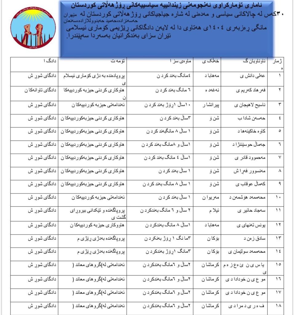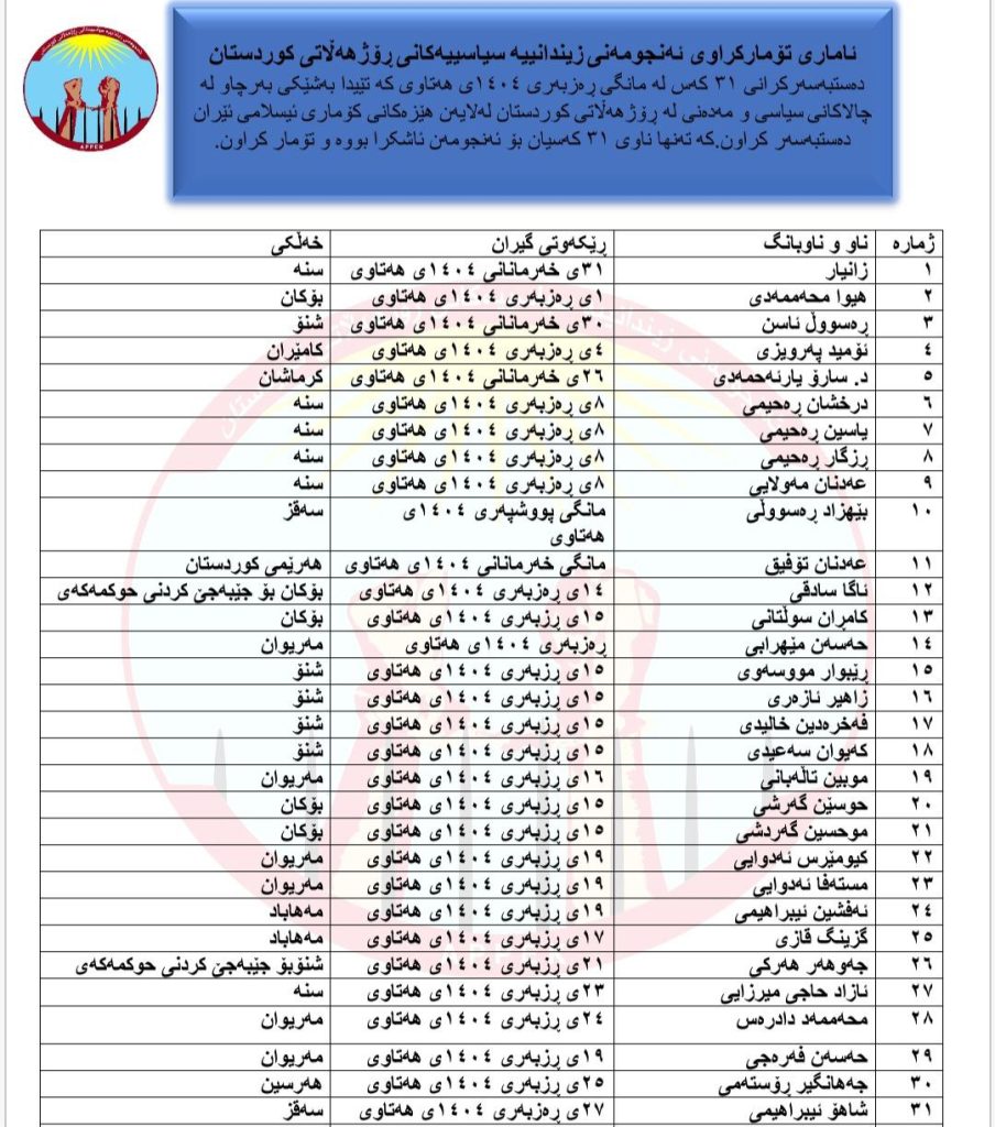 خۆڕاگری:بە پێی ئامارە تۆمار کراوەکانی ئەنجومەنی زیندانییە سیاسییەکانی ڕۆژهەڵاتی کوردستان لە یەک مانگی ڕابردوو دا، واتە مانگی ڕەزبەری ١٤٠٤ی هەتاوی ٣١ کەس لە چالاکانی سیاسی و مەدەنی لە ڕۆژهەڵاتی کوردستان لەلایەن ناوەندە ئەمنییەکانی کۆماری ئیسلامی ئێران بە تۆمەتی چالاکی مەدەنی، دژایەتی لەگەڵ کۆماری ئیسلامی و هاوکاری لەگەڵ حیزبە کوردییەکانی دژبەری کۆماری ئیسلامی ئێران،سیخوری کردن بۆ ئیسرائیل، دەستبەسەر و ڕەوانەی گرتنگە ئەمنییەکانی ئیدارەی ئیتلاعات کراون، کە بەشێکیان دوای تەواو بوونی لێکۆلینەوە بە بارمتەی قورس ئازاد کراون و بەشێکیان تا ئێستا لە ژێر لێکۆڵینەوە دان وچارەنووسیان ناڕوونە.