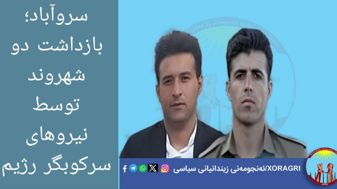 بر اساس گزارش وبسایت خبری خۆڕاگری، صبح روز پنجشنبە، ٢٢ آبان ماه ١٤٠٤ یاسر ادوایی و سلمان ادوایی، دو شهروند اهل شهرستان سروآباد، توسط نیروهای سرکوبگر اطلاعاتی رژیم اسلامی ایران بدون هیچ گونه مدرک قضایی و قانونی بازداشت و به مکان نامعلومی منتقل شدهاند.