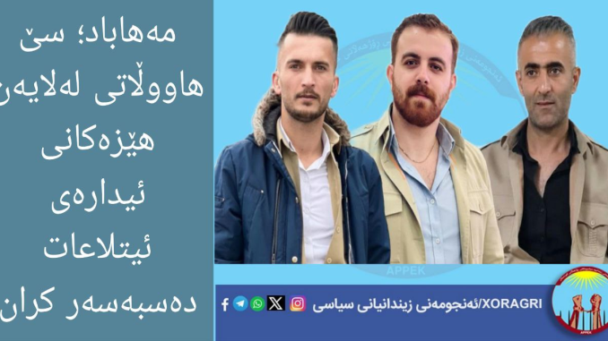 خۆڕاگری: سەعید فەتحینژاد، هێمن ئێوەر و پێشەوا ئارموون، سێ هاووڵاتیی خەڵکی مەهاباد لەلایەن هێزە سەرکوتکەرەکانی ئیتلاعاتی ڕێژیمەوە دەسبەسەر کراون.