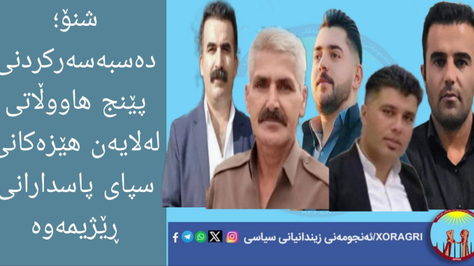 بەپێی هەواڵی ئەنجومەنی زیندانییە سیاسییەکانی ڕۆژهەڵاتی کوردستان ‘خۆڕاگری” ڕۆژی پێنچشەممە، ١٣ی سەرماوەزی ١٤٠٤ی هەتاوی (٤ی ١٢ی ٢٠٢٥ی زایینی)، حەسەن شادیخا خەڵكی گوندی سینگان، هێرش پەڕنیا، ئیسماعیل سەیدمەحموودیان، شۆڕشی سەرڕووتی خەڵكی گوندی نەڵیوان و شوانە ئیبراهیمی خەڵكی گوندی ئاڵکاوێ، پێنج هاووڵاتیی خەڵكی شاری شنۆ و گوندەکانی دەوروبەری لەلایەن هێزە سەرکوتکەرەکانی ڕێژیمی ئیسلامیی ئێرانەوە بەبێ بوونی هیچ بەڵگەیەکی قەزایی و یاسایی بەشێوەیەکی دڕەندانە دەسبەسەر کراون و چارەنووسیان نادیارە.