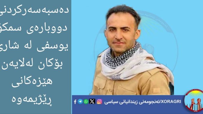 بەپێی هەواڵی ماڵپەڕی ئەنجومەنی زیندانییە سیاسییەکانی ڕۆژهەڵاتی کوردستان “خۆڕاگری” بەیانی ڕۆژی دووشەممە، ۱۷ی سەرماوەزی ۱٤۰٤ی هەتاوی (٨ی ۱۲ی ۲۰۲٥ی زایینی) سمکۆ یوسفی، مامۆستای زمانی کوردی و هاووڵاتیی خەڵکی شاری بۆکان، لە یەکێک لە شەقامەکانی ئەو شارە لەلایەن هێزە سەرکوتکەرەکانی ڕێژیمی ئێرانەوە بەشێوەیەکی دڕەندانە جارێکی دیکە دەسبەسەر کراوە و گوازراوەتەوە بۆ شوێنێکی نادیار.