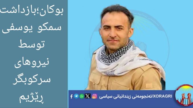 بر اساس گزارش وبسایت خبری انجمن زندانیان سیاسی شرق کردستان “خۆڕاگری”، صبح روز دوشنبه، ۱۷ آذر ۱۴۰۴ خورشیدی (۸ دسامبر ۲۰۲۵ میلادی)، سمکو یوسفی، معلم زبان کردی و شهروند اهل شهر بوکان، در یکی از خیابانهای آن شهر توسط نیروهای سرکوبگر رژیم ایران به شیوهای وحشیانه بار دیگر بازداشت و به مکانی نامعلوم منتقل شده است. نیروهای سرکوبگر رژیم ایران بدون در دست داشتن هیچ حکم قضایی و قانونی، با اعمال خشونت او را بازداشت و به مکانی نامعلوم ربودهاند. همچنین تاکنون هیچ اطلاعات دقیق و درستی از دلیل بازداشت، محل نگهداری و سرنوشت او در دسترس نیست و پیگیریهای خانوادهاش نیز بینتیجه مانده است.