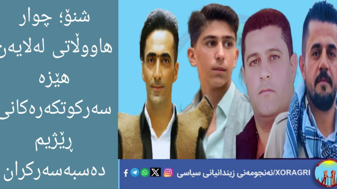 خۆڕاگری: شاهۆ ئیبراهیمی، سیراج ئەلیاسی، فەرعان چووپان و شەفیع ئەحمەدی، چوار هاووڵاتیی شنۆ، لەلایەن هێزە سەرکوتکەرەکانی ڕێژیمی ئێرانەوە دەسبەسەر و گوازراونەتەوە بۆ شوێنێکی نادیار.