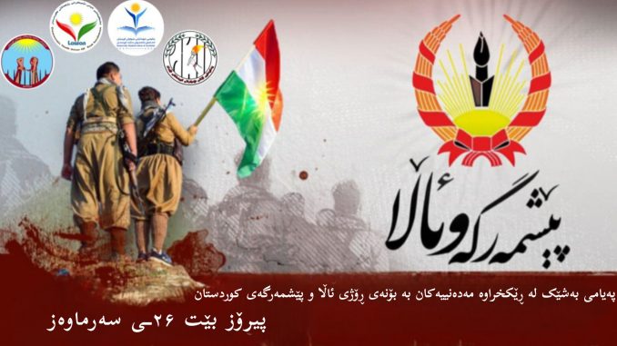 ئێمە وەک بەشێک لە ڕێکخراوە مەدەنییەکانی ڕۆژهەڵاتی کوردستان لەگەڵ ئەوەی لەم ڕۆژەدا گەرمترین پیرۆزباییی خۆمان ئاراستەی هەموو کۆمەڵانی خەڵکی کوردستان، پێشمەرگە گیانفیداکانی کوردستان و بنەماڵەی سەربەرزی شەهیدان و زیندانییانی سیاسی دەکەین، هاوکات شانازی بەوەوە دەکەین پێکهاتەی هێزی پێشمەرگەی کوردستان لە لاوانی دەروەست، خوێندکارانی وشیار و ژنانی بەرهەڵستکاری کۆمەڵگەکەمان پێک هاتووە و لە پێناو دەستەبەرکردنی سەروەریی کوردستاندا چەکی پاراستنی نیشتمان و پاراستنی بەها مرۆڤییەکانیان کردووەتە شان و لەم ڕێیەدا فیداکارییان نواندووە و گیانیان لەپێناو داناوە. ئێمە شانازییان پێوە دەکەین و خۆمان بە هاوخەباتی هەمیشەییی هێزی پێشمەرگەی کوردستان دەزانین، لەهەمان کاتیشدا بەڵێنمان لەگەڵ شەهیدانی کوردستان نوێ دەکەینەوە کە تا گەیشتن بە دوایین وێستگەی سەرکەوتن و هێنانە دیی ئامانجەکانیان، لە خەبات و تێکۆشانی شوناسپارێزانەی خۆمان بەردەوام دەبین.