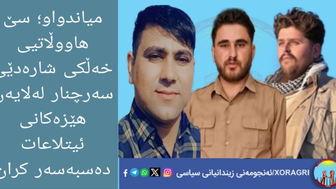 بەپێی هەواڵی ئەنجومەنی زیندانییە سیاسییەکانی ڕۆژهەڵاتی کوردستان “خۆڕاگری” ڕۆژی پێنجشەممە، ٢٧ی سەرماوەزی ١٤٠٤ی هەتاوی (١٨ی دێسامبری ٢٠٢٥ی زایینی) حەسەن ڕەمەزانی، بەهمەن ئەحمەدزادە و سالار ئوستادئەحمەدی، سێ هاووڵاتیی خەڵكی شارەدێی سەرچناری سەربە شاری میاندواو لەلایەن هێزە سەرکوتکەرەکانی ڕێژیمی ئێرانەوە بەبێ بوونی هیچ بەڵگەیەکی قەزایی و یاسایی دەسبەسەر کراون و گوازراونەتەوە بۆ شوێنێکی نادیار.
