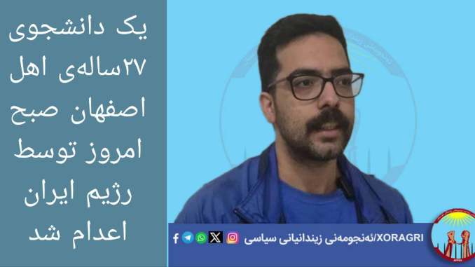 خۆڕاگری: عقیل کشاورز دانشجوی اهل اصفهان، به اتهام جاسوسی برای اسرائیل توسط رژیم ایران در زندان ارومیه اعدام شده است.