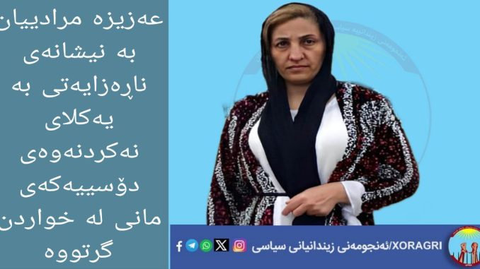 بەپێی هەواڵی ئەنجومەنی ماڵپەڕی ئەنجومەنی زیندانییە سیاسییەکانی ڕۆژهەڵاتی کوردستان “خۆڕاگری” ڕۆژی دووشەممە، ۱ی بەفرانباری ۱٤۰٤ی هەتاوی ” ۲۱ی دێسامبری ۲۰۲٥ی زایینی” عەزیزە مرادیان، هاووڵاتیی خەڵکی گوندی تەنگیسەری سەربەر شاری سنە و بەندکراو لە بەندیخانەی ناوەندیی ئەو شارە، بەنیشانەی ناڕەزایەتییدەربڕین بە ناڕوونی چارەنووسی و وڵامنەدانەوەی بەرپرسانی بەندیخانە بە داواکارییەکانی، مانی لەخواردن گرتووە و ئەوەش دەبێتە هۆی مەترسی بۆ سەر ژیانی.