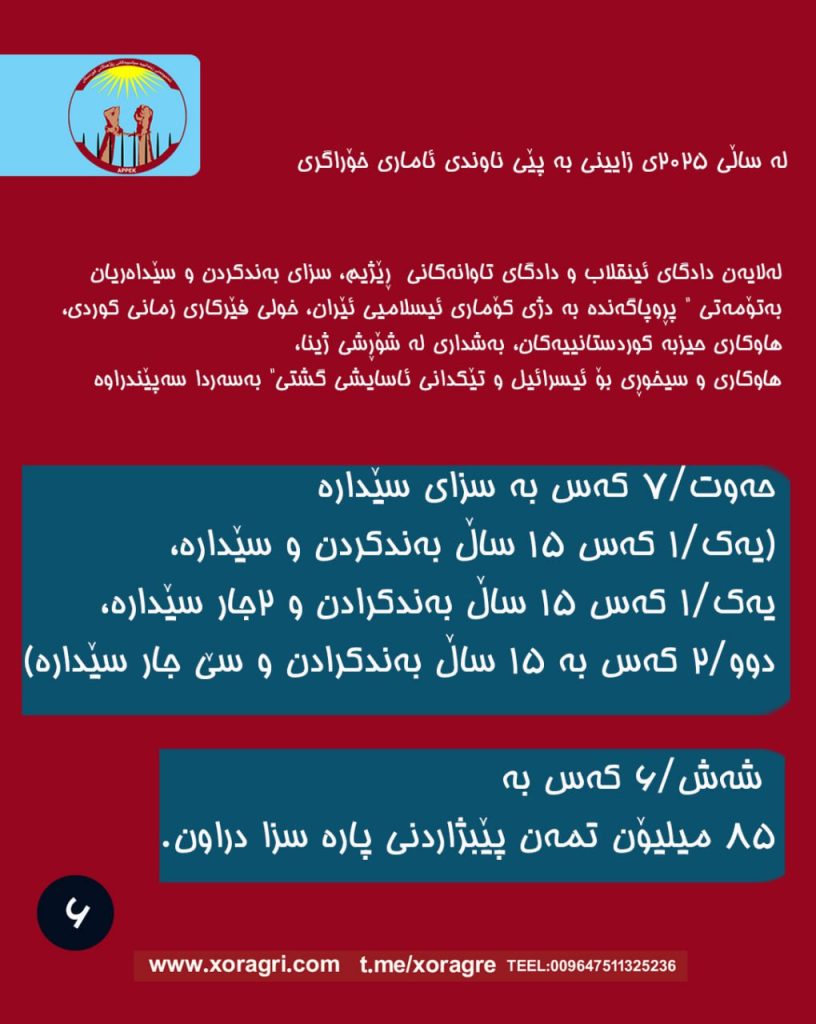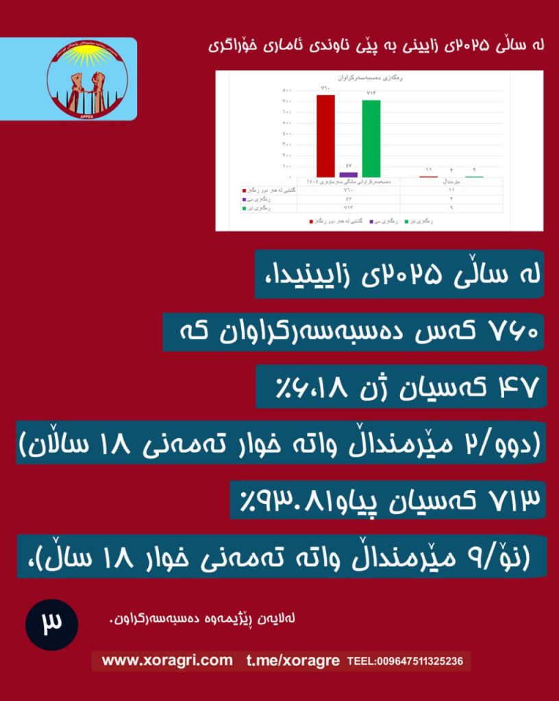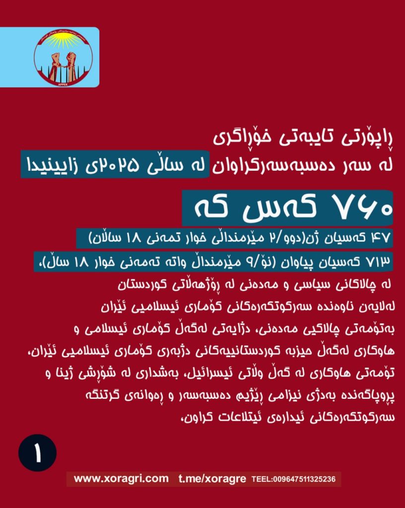 لە ساڵی ٢٠٢٥ی زایینیدا، ٧٦٠ کەس کە ٤٧ کەسیان ژن(دوو/٢ مێرمنداڵی خوار تمەنی ١٨ ساڵان) و ٧١٣ کەسیان پیاوان (نۆ/٩ مێرمنداڵ واتە تەمەنی خوار ١٨ ساڵ)، لە چالاکانی سیاسی و مەدەنی لە ڕۆژهەڵاتی کوردستان لەلایەن ناوەندە سەرکوتکەرەکانی کۆماری ئیسلامیی ئێران بەتۆمەتی چالاکیی مەدەنی، دژایەتی لەگەڵ کۆماری ئیسلامی و هاوکاری لەگەڵ حیزبە کوردستانییەکانی دژبەری کۆماری ئیسلامیی ئێران، تۆمەتی هاوکاری لە گەڵ وڵاتی ئیسرائیل، بەشداری لە شۆڕشی ژینا و پڕوپاگەندە بەدژی نیزامی ڕێژیم دەسبەسەر و ڕەوانەی گرتنگە سەرکوتکەرەکانی ئیدارەی ئیتلاعات کراون، کە بەشێکیان دوای تەواوبوونی لێکۆڵینەوە، بە بارمتەی قورس ئازاد کراون و بەشێکشیان تا ئێستا لە ژێر لێکۆڵینەوەدان وچارەنووسیان ناڕوونە و بەشێکیشیان بە سێدارە سزا دراون: