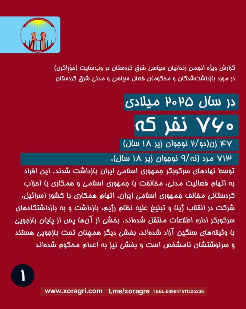 در سال ۲۰۲۵ میلادی، ۷۶۰ نفر از فعالان سیاسی و مدنی در شرق کردستان، شامل ۴۷ زن (که دو/۲ نفر از آنها نوجوان زیر ۱۸ سال بودند) و ۷۱۳ مرد (که نه/۹ نفر از آنها نوجوان یعنی زیر ۱۸ سال بودند)، توسط نهادهای سرکوبگر جمهوری اسلامی ایران بازداشت شدند. این افراد به اتهام فعالیت مدنی، مخالفت با جمهوری اسلامی و همکاری با احزاب کردستانی مخالف جمهوری اسلامی ایران، اتهام همکاری با کشور اسرائیل، شرکت در انقلاب ژینا و تبلیغ علیه نظام رژیم، بازداشت و به بازداشتگاههای سرکوبگر اداره اطلاعات منتقل شدهاند. بخشی از آنها پس از پایان بازجویی با وثیقههای سنگین آزاد شدهاند، بخشی دیگر همچنان تحت بازجویی هستند و سرنوشتشان نامشخص است و بخشی نیز به اعدام محکوم شدهاند: