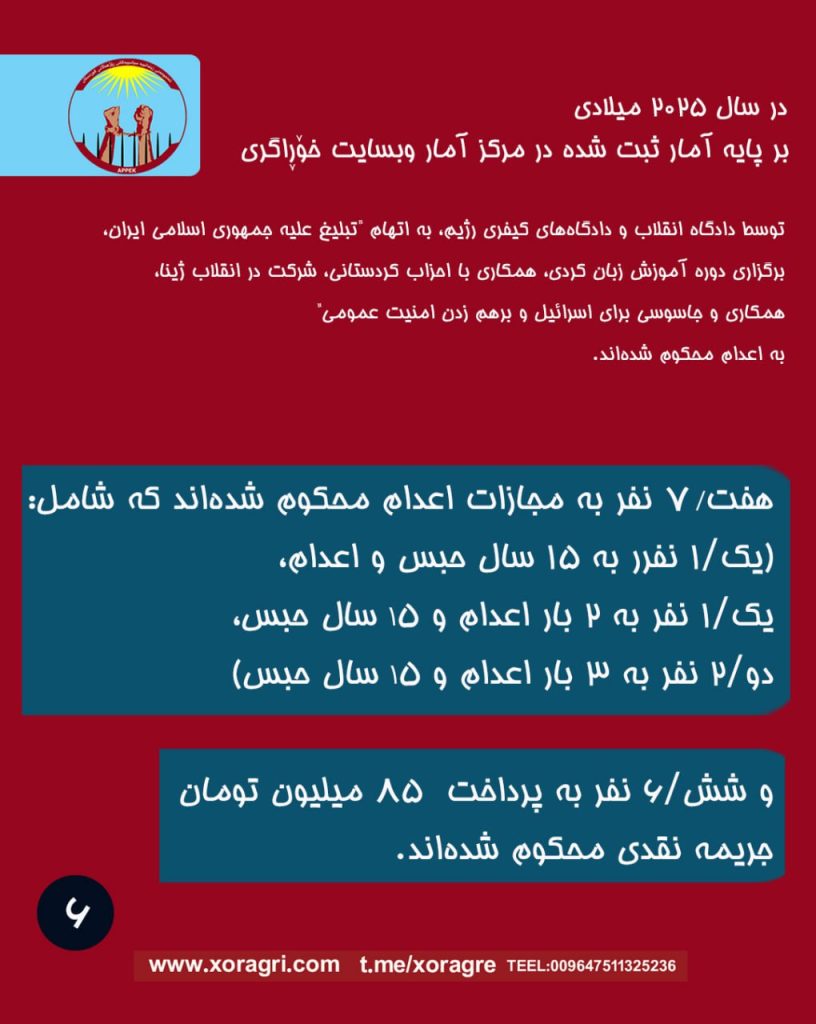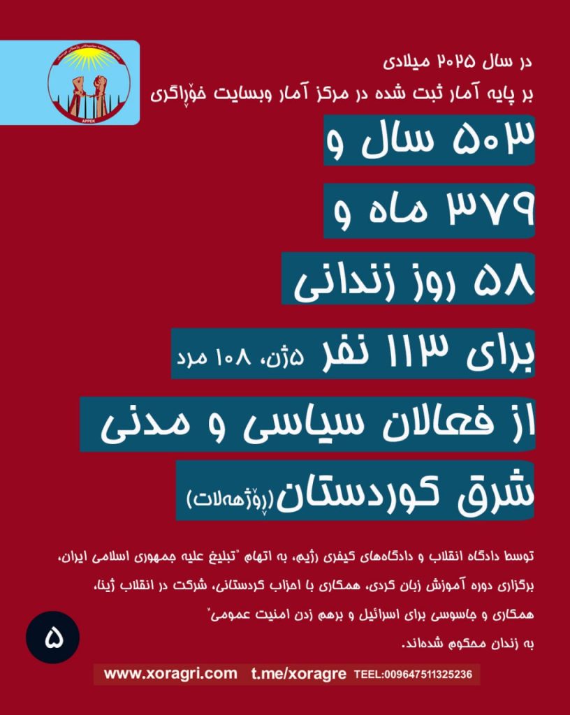 صد و سیزده/۱۱۳ نفر از فعالان سیاسی و مدنی که پنج/۵ نفر از آنان زن و ۱۰۸ نفر از آنان مرد هستند، در شهرهای شرق کردستان که پیشتر توسط نهادهای سرکوبگر بازداشت شده بودند، توسط دادگاه انقلاب و دادگاههای کیفری رژیم، به اتهام “تبلیغ علیه جمهوری اسلامی ایران، برگزاری دوره آموزش زبان کردی، همکاری با احزاب کردستانی، شرکت در انقلاب ژینا، همکاری و جاسوسی برای اسرائیل و برهم زدن امنیت عمومی” به زندان و اعدام محکوم شدهاند. در مجموع برای آنها ۵۰۳ سال و ۳۷۹ ماه و ۵۸ روز حبس صادر شده و هفت/۷ نفر به مجازات اعدام محکوم شدهاند که شامل: (یک/۱ نفر ۱۵ سال حبس و اعدام، یک/۱ نفر ۲ بار اعدام و ۱۵ سال حبس، دو/۲ نفر ۳ بار اعدام و ۱۵ سال حبس) و شش/۶ نفر به پرداخت ۸۵ میلیون تومان جریمه نقدی محکوم شدهاند.