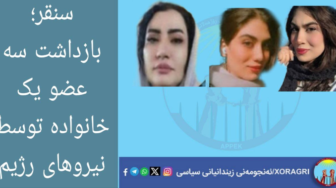 خۆڕاگری: سه زن از اعضای یک خانواده اهل سنقر کرمانشاه به نامهای فرنوش، زهره پاشایی و بهار رفیعی ۱۷ ساله توسط رژیم بازداشت شدهاند.