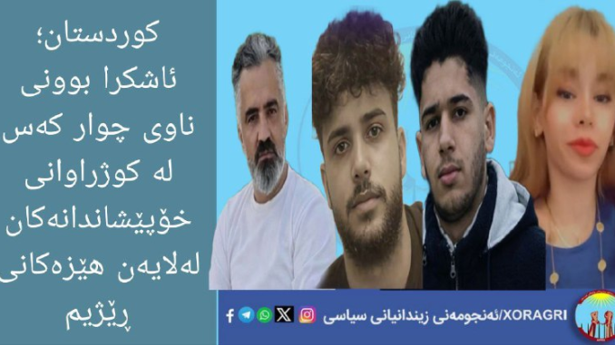 خۆڕاگری: چوار هاووڵاتیی خەڵكی کرماشان بەناوەکانی ” ئیبراهیم یووسفی، ڕوبینا ئەمینیان، ڕەزا قەنبەری و سامان نەزەری” بە تەقەی ڕاستەوخۆی هێزە چەکدارەکانی ڕێژیمی ئێران گیانیان لەدەستداوە.